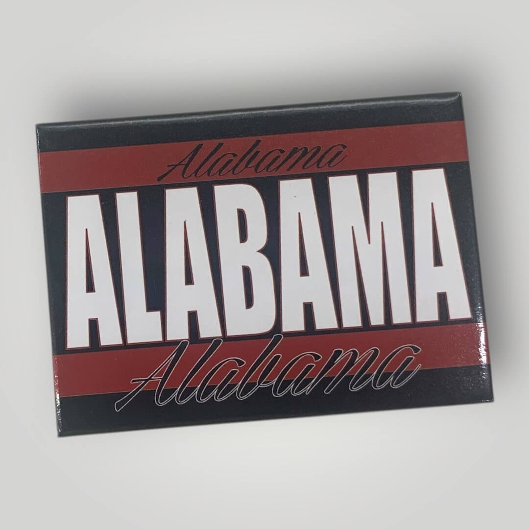 Show off your Sweet Home Alabama pride with this eye-catching magnet! Featuring bold red, black, and white lettering that beautifully showcases the state, this magnet is the perfect way to remember your Alabama adventure or share your state love with friends and family.